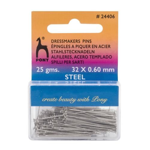 Булавки портновские PONY с головками в форме шляпки гвоздя – наиболее распространенный тип булавок. Такие булавки широко используются в быту, при шитье одежды или примерке. Булавки набор применяются также при раскрое, примерке, пошиве изделий из текстиля и создании различных поделок.