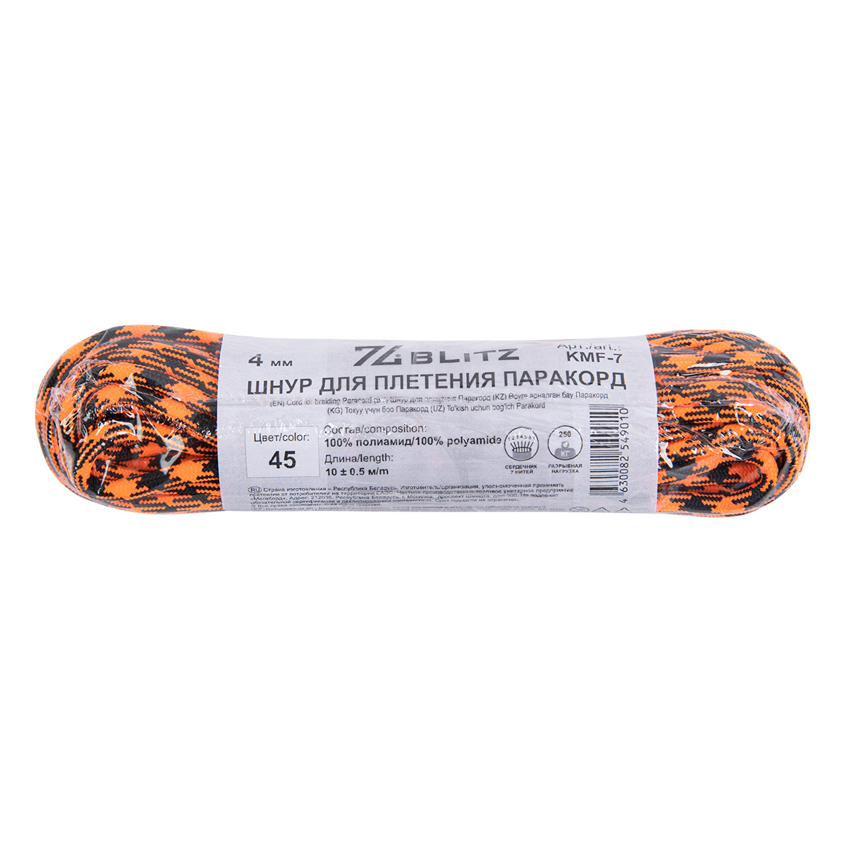 Шнур KMF-7 4 мм паракорд с сердечником 10 м ± 0.5 м №45 неон черный/оранжевый (арт. KMF-7)